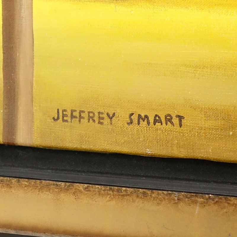 After: Jeffrey Edson Smart, Australian (1921-2013) Oil on canvas "The Train". Signed lower right. Good condition. Measures 20" x 60", frame measures 28" x 68". Shipping: Third party. (estimate $600-$800)