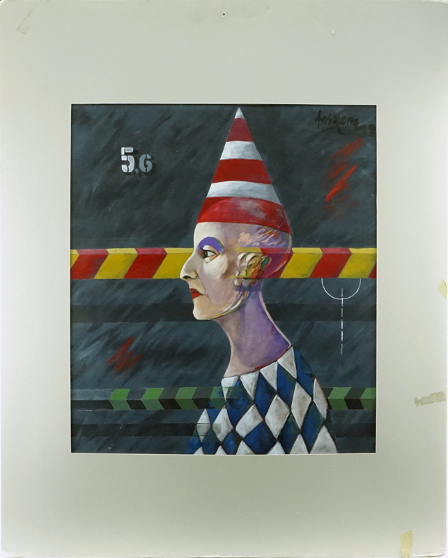 Jose Mario Ansalone, Argentine (1943 - ) Acrylic on canvas "Clown". Signed and dated '99 upper right. Affixed to cardboard and mat or in good condition. Measures 40" x 32" overall. Shipping: Third party. (estimate $600-$800)