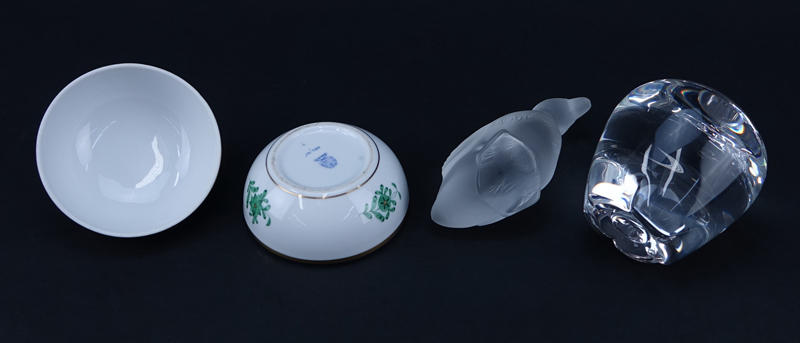 Collection of Three (3) Tableware. Includes: Steuben crystal apple paperweight 4-1/4" H, Baccarat frosted crystal resting duck paperweight 3" H, and Herend porcelain covered box 3-7/8" H. Herend has nick to finial, scuffs on underside of apple paperweight or else good condition. Shipping $48.00 (estimate $100-$150)