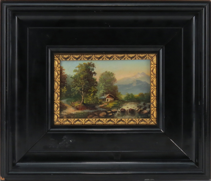 19th Century Austrian "Das Passeiertal in Tirol" Oil on Wood Panel. Signed with "Z" shaped letter lower right. Inscribed and has Vom Bundesdenkmalamt zur Ausfuhr freigegeben mark en verso. Some craquelure. Measures 4" H x 6" W, frame measures 10-1/2" H x 12-1/4" W. Shipping $62.00 (estimate $200-$300)