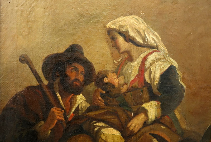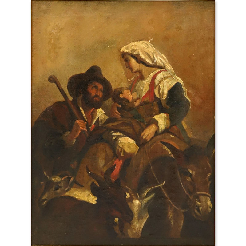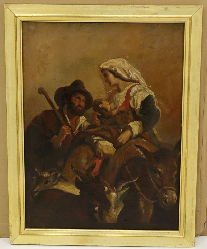 Early 20th Century Continental Oil On Canvas Laid Down On Board "Traveling Family". Possible indistinct signature lower right. Craquelure, 2 small areas of restoration. Measures 16" x 12", frame measures 18" x 14". Shipping $125.00 (estimate $200-$300)