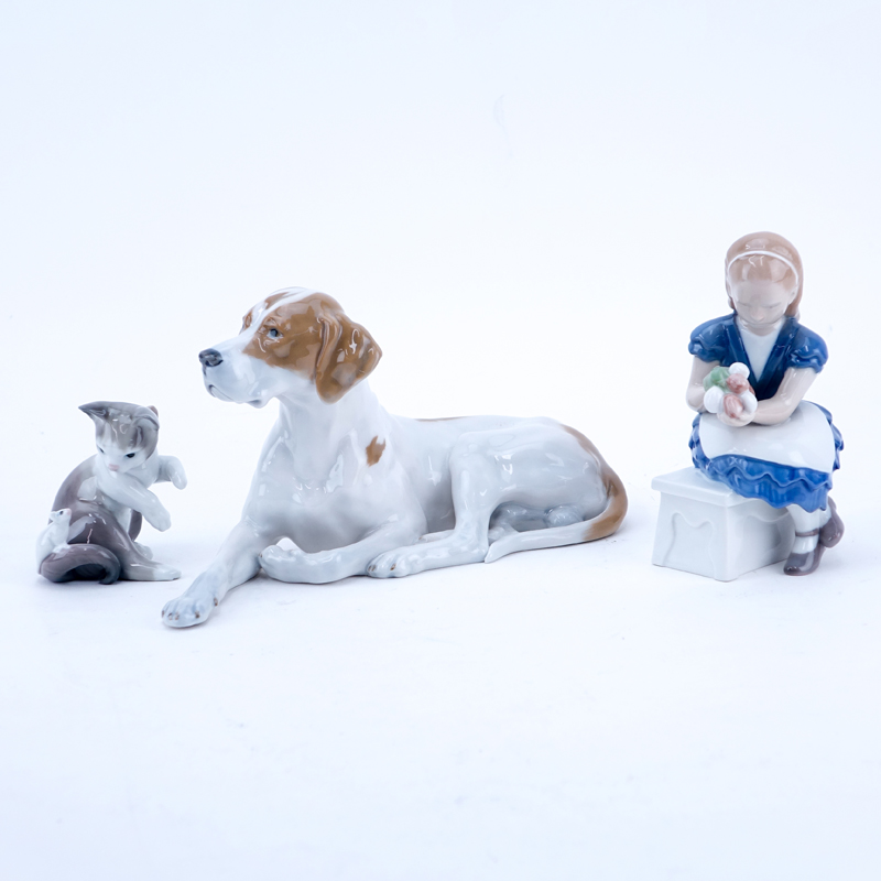 Collection of Three (3) Porcelain Figurines. Comprise: Royal Copenhagen Laying Down Pointer #1635, B&G Little Ida's Flowers #2298, and Lladro Cat and Mouse #5236. All signed appropriately. Largest measures 5-1/4" H x 10" W. Shipping $86.00 (estimate $100-$150)
