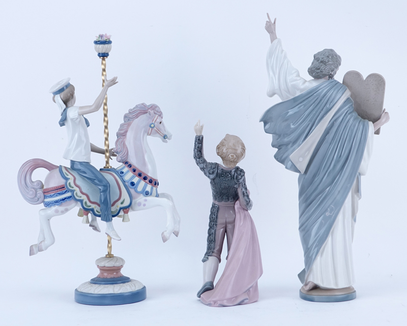 Lot of Three (3) Lladro Figurines. Includes: Moses, 16", repair to finger; Boy on Carousel, repair to horses leg and loss to flowers, 15-1/2" H, Matador, small loss to finger, 10-1/2" H. All pieces signed appropriately. Shipping: Third party (estimate $200-$300)