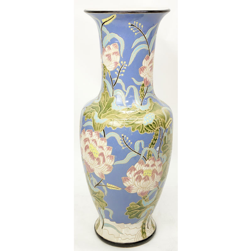 Monumental Majolica Pottery Vase. Features Asian inspired lotus flower motif on blue ground. Unsigned. Good condition. Measures 40-3/4" H x 13-1/2" dia at top. Shipping: Third party. (estimate $400-$600)