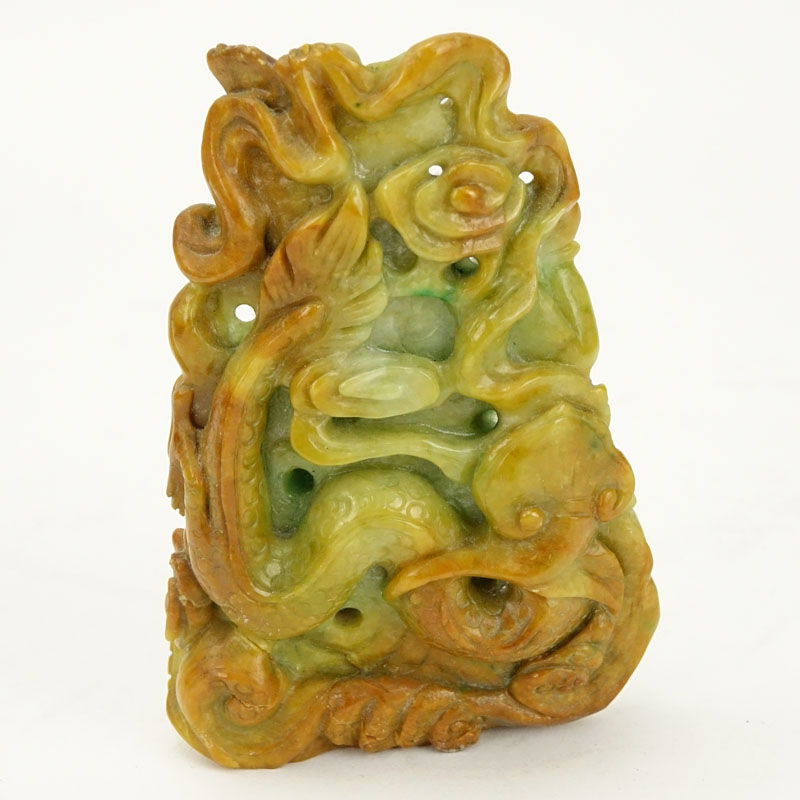 Chinese Jade Dragon with Figure Carving. Light green with amber color splashes. Natural wear or else good condition. Measures 3-3/4" H x 2-1/2" W. Shipping $35.00 (estimate $200-$300)