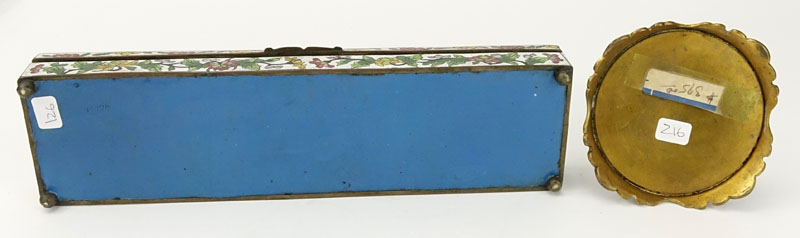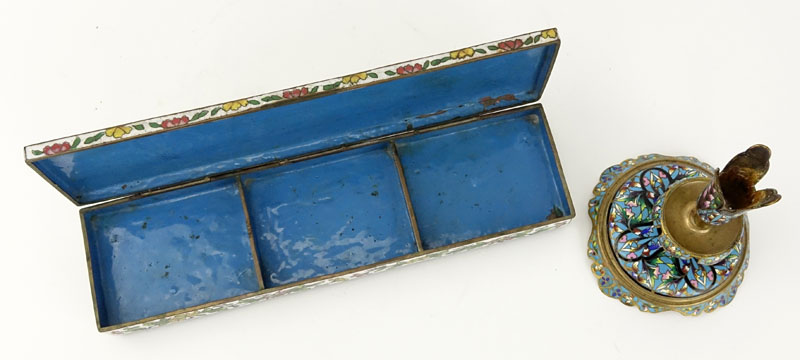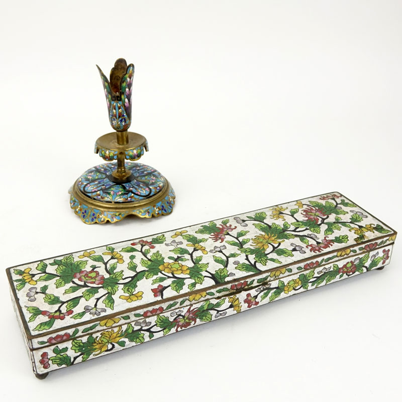 Two (2) Piece Lot of Vintage Chinese Cloisonné Table Top Items. Includes a long box, signed China and a candleholder, unsigned. Box measures 11-3/4" L has light crazing. The candleholder measures 5" H and is in good condition. Shipping $56.00 (estimate $250-$350)