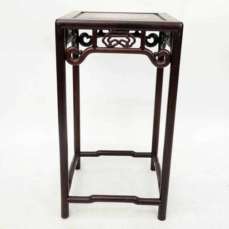 Modern Chinese Carved Hard Wood Pedestal Table. Unsigned. Wear, rubbing one decoration on apron with small split. Measures 27-1/2" H x 14-3/4" x 14-3/4". Shipping: Third party. (estimate $150-$250)