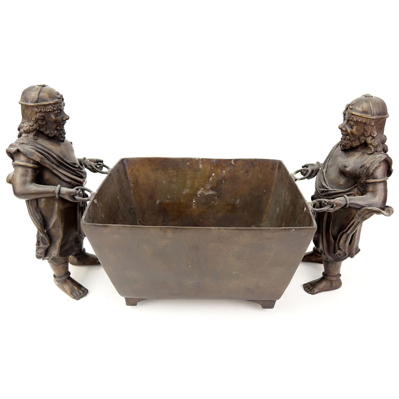 20th Century Bronze Figural Planter. Unsigned. Features two bearded figures holding a footed planter. Rubbing to patina, possible repair to handles. Measures 15" H x 24-1/2" W x 11-7/8" Depth. Shipping: Third party. (estimate $200-$400)