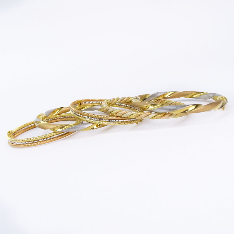 Collection of Five Vintage Italian Tri-Color Gold Bangles Including Three (3) 18 Karat and Two (2) 14 Karat. All stamped. Good condition. Measure 2-3/8" interior diam., 3/16" to 1/4" W. Approx. weight: 48.2 grams. Shipping $36.00 (estimate $1000-$1200)