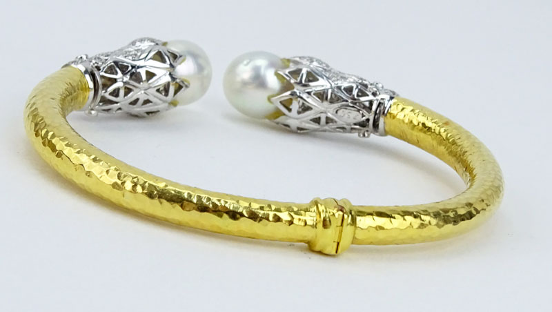 Vintage 18 Karat Yellow Gold, approx. 2.0 Carat Pave Set Diamond and South Sea Pearl Hammered Hinged Cuff Bangle.