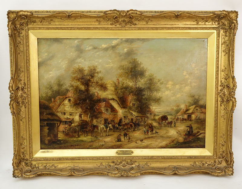 Georgina Lara, British (fl.1862 - 1871) Oil on Canvas "Village Scene." Tag signed G. La'ra , titled,