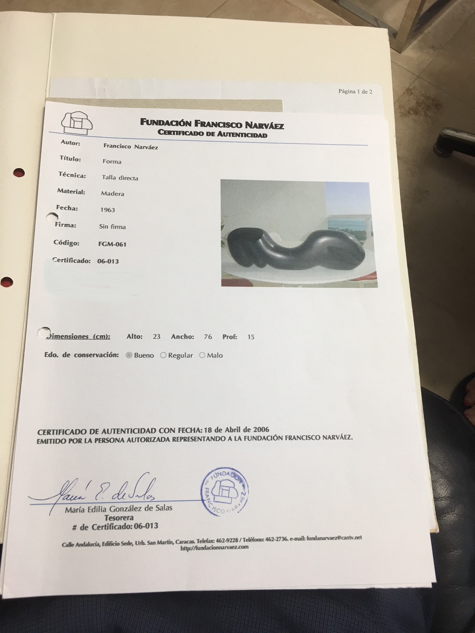 Francisco Narvaez, Venezuelan (1905-1982) Carved Ebony "Torso In Repose" unsigned. Overall very good condition with only minor rubbing. Natural wood graining evident. Measures 9-1/2" x 30". Original purchase receipt and COA accompanies the lot. Shipping: Third party. (estimate $30000-$40000)