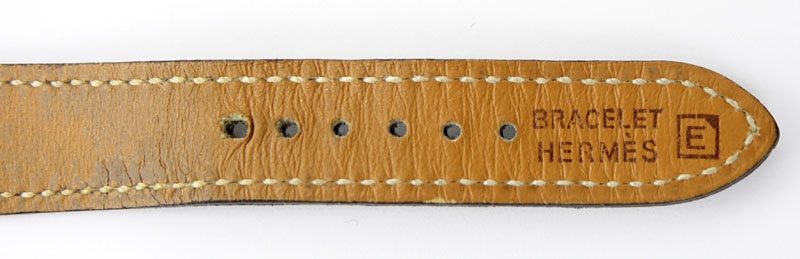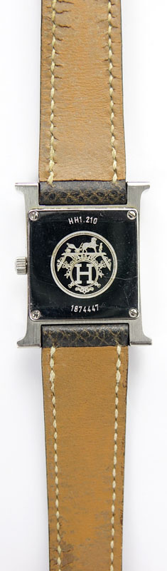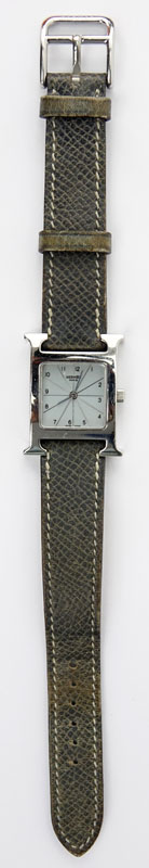 Hermes H Watch With Etoupe Clemence Leather Strap. Quartz movement. Signed. Ref #HH1.210 Serial #1874447. With box and papers. Gently worn with some soiling on inside of strap. Case measures 21mm. Strap 8" L. Shipping $30.00 (estimate $800-$1000)