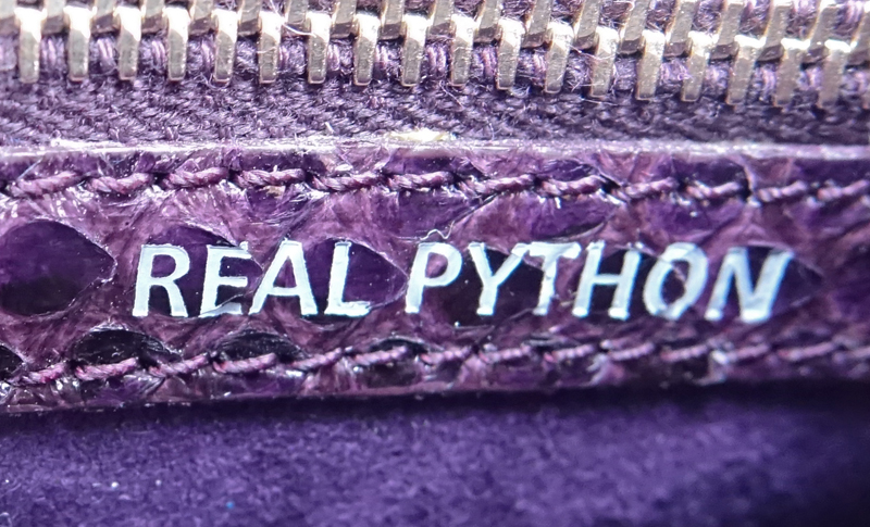 Tod's Purple Colorblock Python Mini Fleur Pochette. Gold-tone hardware, leather wristlet strap at side, navy purple suede interior, single pocket at interior wall with zip closure and flap with turn-lock closure at front. Includes a dust bag (not original). Labeled appropriately, tag (retail $1875.00), care card. Like New condition. Measures 5-1/2" H x 8" L x 2" D. Shipping $48.00 (estimate $1000-$1200)