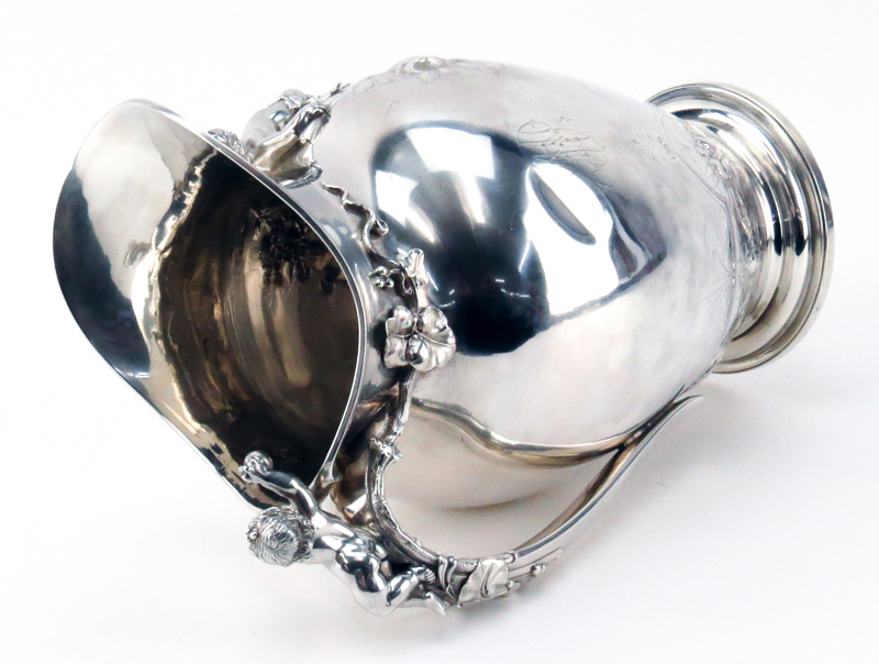 Gorham Art Nouveau Sterling Silver High Relief Cherub and Foliage Water Pitcher. Stamped with Gorham hallmarks, W. Wilson Mc Grew, and numbered 490. Small dent to bowl. Measures 11-3/4" H. Approx. weight: 43.96 troy ounces. Shipping $75.00 (estimate $1500-$2000)
