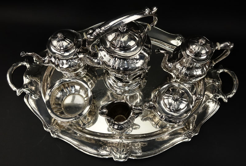Important Gorham Martele .9584 Silver Tea and Coffee Service With Tray Circa 1910. Retailed by Spaulding & Co., Chicago. The set includes, Water Kettle, Tea Pot, Coffee Pot, Covered Sugar Bowl, Cream Pitcher, Waste Bowl and Tray. Decorated with leaves and floral blooms motif. Signed Martele Gorham (logo) .9584 and item letters PDF-PDK indicating the pieces are from the same set, Spaulding & Co Chicago, Monogram. The kettle warmer is missing, extremely shallow ding on tea pot or in very good condition. The tray measures 31-1/4" x 21-3/8" and the total set weighs 348.815 troy ounces. Shipping: Third party. (estimate $30000-$40000)