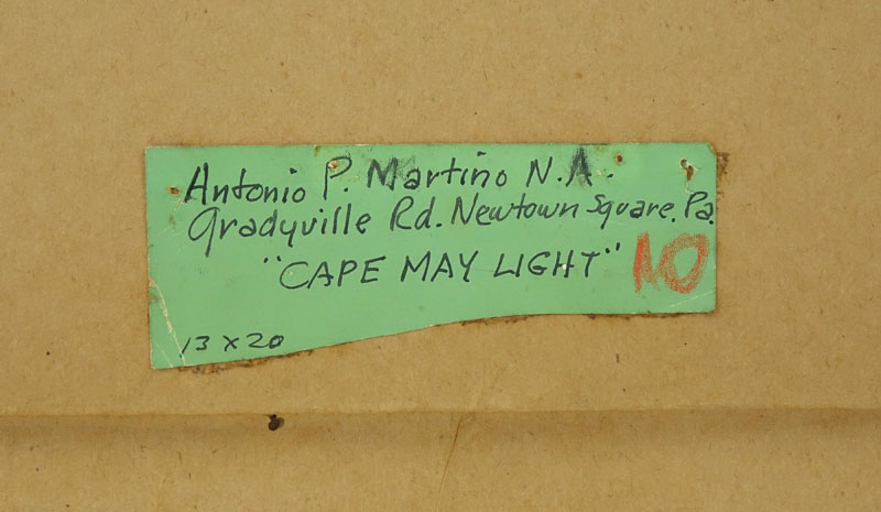 Antonio Pietro Martino, American (1902-1988) Oil on board "Cape May Light". Signed lower left, label en verso. Good condition. Measures 14-1/2" x 21-1/4", frame measures 18" x 25". Shipping $165.00 (estimate $3000-$5000)