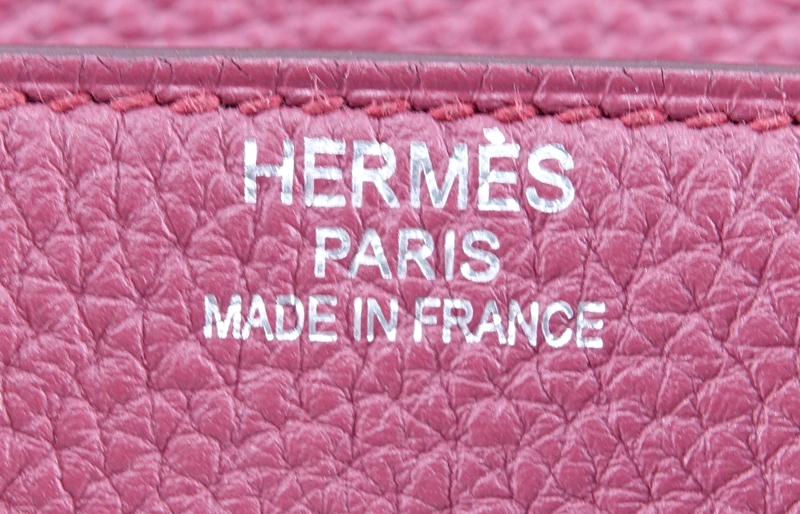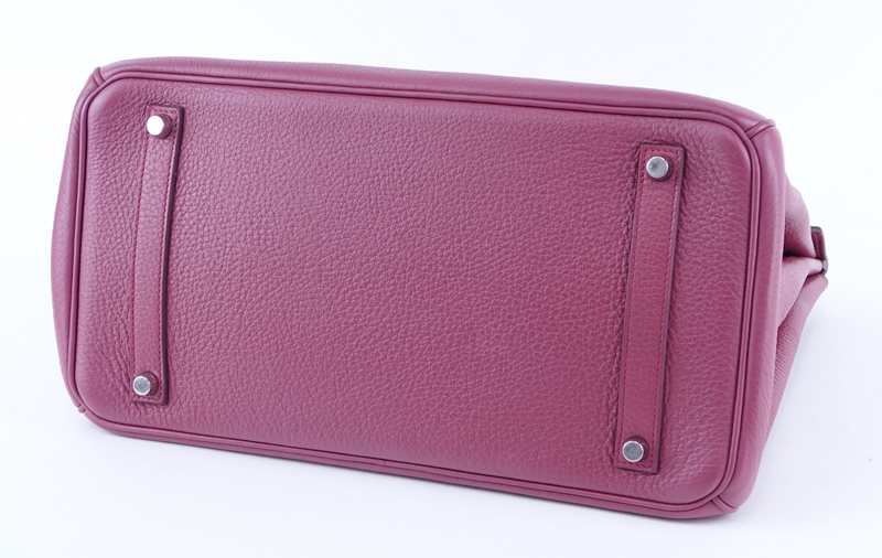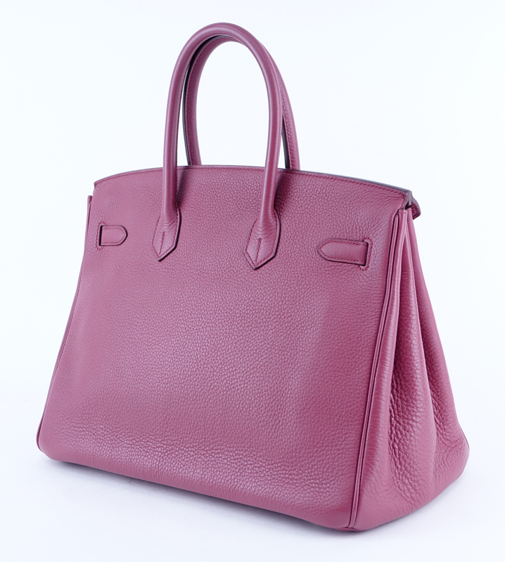 Hermes Bois de Rose Togo Birkin 35 Bag. Palladium hardware , Lock, Key, Clochette. Labeled appropriately, blindstamp O in square - 2011. As New condition, never carried with the protective plastic intact on the hardware. Measures 14" L x 11-1/2" H x 7" D. Original bag included. Shipping $105.00 (estimate $9000-$10000)