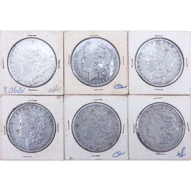 Collection of Six (6) Morgan Silver Dollars. Dates ranging from 1884-1921.