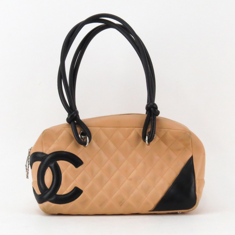 Chanel Linge Cambon Quilted Leather Bowler Bag. Features the CC logo on the corner and double-strand knotted shoulder straps. The inside has black CC signature textile lining. Zipper and slot pockets on interior. Used condition with soling and wear. Measures 6-1/2" H x 11" W x 4" D. Dust bag and authenticity card included. Shipping $48.00 (estimate $700-$900)