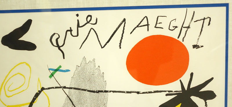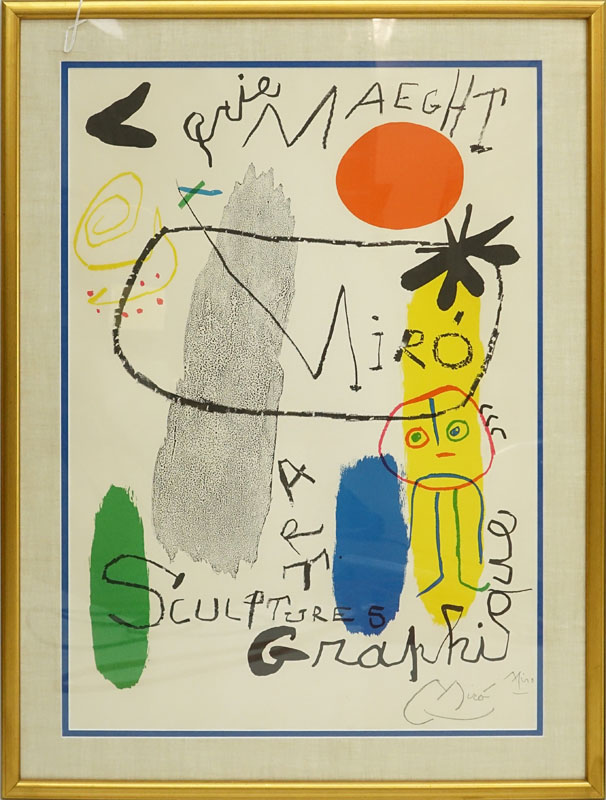 After: Joan Miro, Spanish (1893 - 1983) "Galerie Maeght Miro Sculptures Art Graphique" Poster, Signed Lower Right. Good condition. Measures 24-1/2" H x 17-1/4" W (sight), frame measures 29-5/8" H x 22-1/4" W. Shipping $135.00 (estimate $200-$400)
