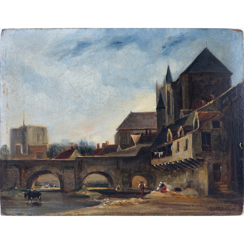 19/20th Century Continental School Oil on Panel, Village Scene. Signed (illegible) lower right. Craquelure, rubbing and losses to edges. Measures 9" H, 11-3/4" W. Shipping $38.00 (estimate $100-$200)