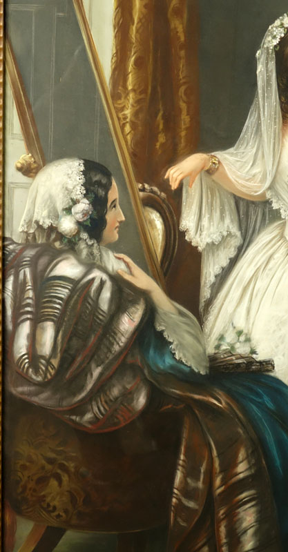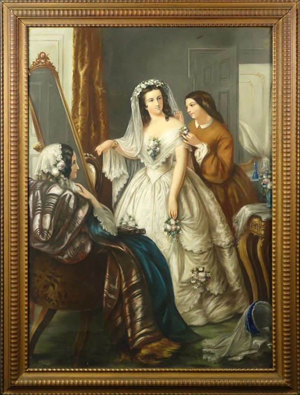 George G. Fish, American (1846-1880) Pastel, The Wedding Day. Signed lower left. Possible small smudge to upper left edge, otherwise very good condition (not examined out of frame). Measures 49-1/8" H, 35-1/8" W (sight); frame measures 57" H, 42-1/2" W. Shipping: Third Party. (estimate $3000-$5000)