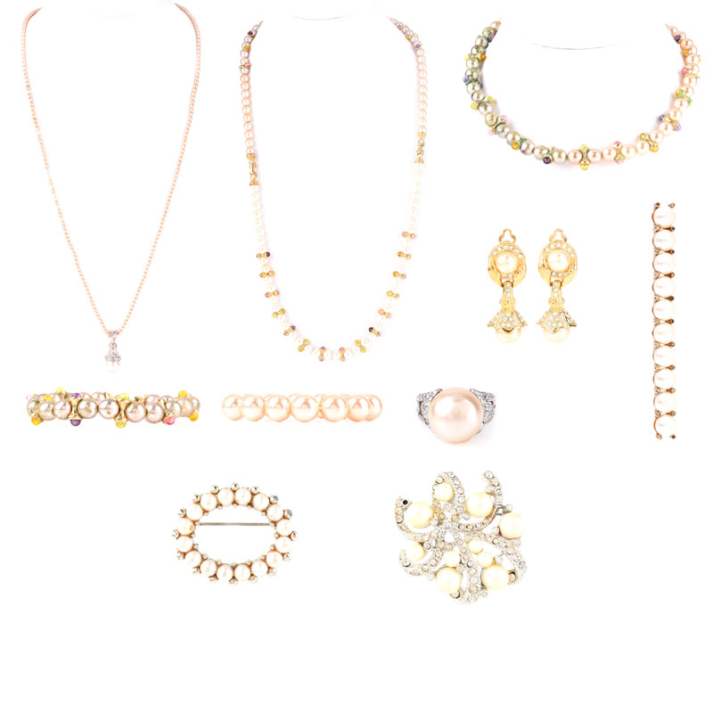 Ten (10) Pieces Faux Pearl Costume Fashion Jewelry. Bracelets, necklaces, pin, earrings, ring. Unsigned. Good Condition. Shipping $25.00 (estimate $25-$50)