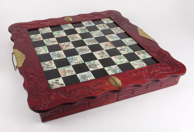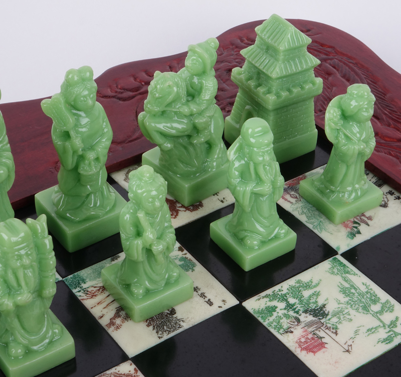 Vintage Chinese Chess Set. Carved wood case with faux ivory and faux lacquer inset board. Faux jade and faux cinnabar chess pieces. Unsigned. Good condition. Case measures 19" x 18-3/4". Shipping $85.00 (estimate $100-$150)