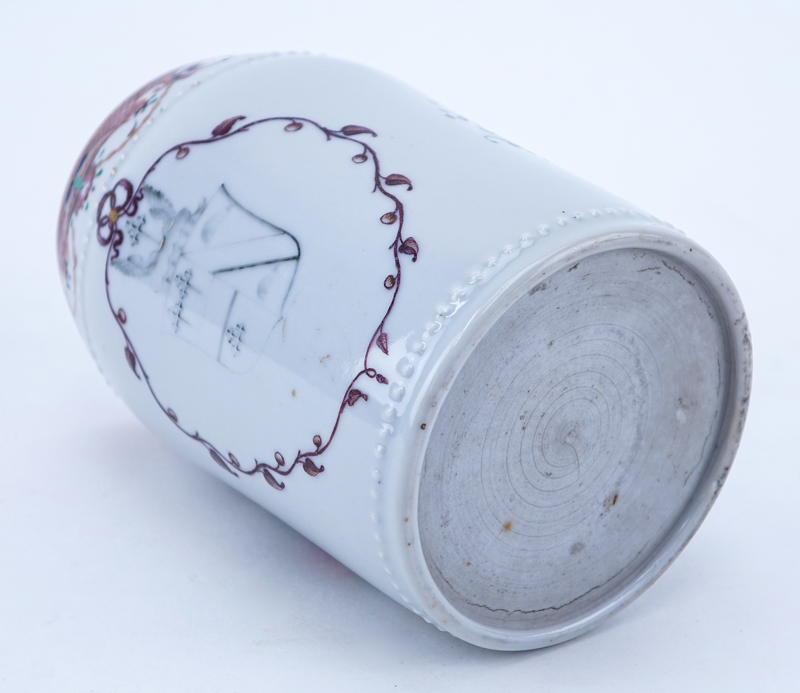 Early Chinese Export Pottery Tankard. Made for the European market, decorated with a handpainted with floral motif and a crest inside a cartouche, intertwining handle. Unsigned. Wear or in good condition. Measures 5-1/4" H. Shipping $48.00 (estimate $150-$250)