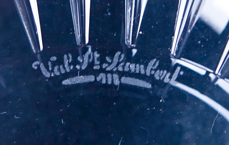Large Collection of Val St. Lambert Crystal Tableware. Includes: 8 crescent salad dishes, tall vase, rose bowl, 4 finger bowls, large serving platter, 5 etched bowls, and 8 zodiac coasters. All signed appropriately. All in good condition. Vase measures 9" H, platter measures 12" Dia., rose bowl measures 6" H. Shipping: Third party. (estimate $150-$250)