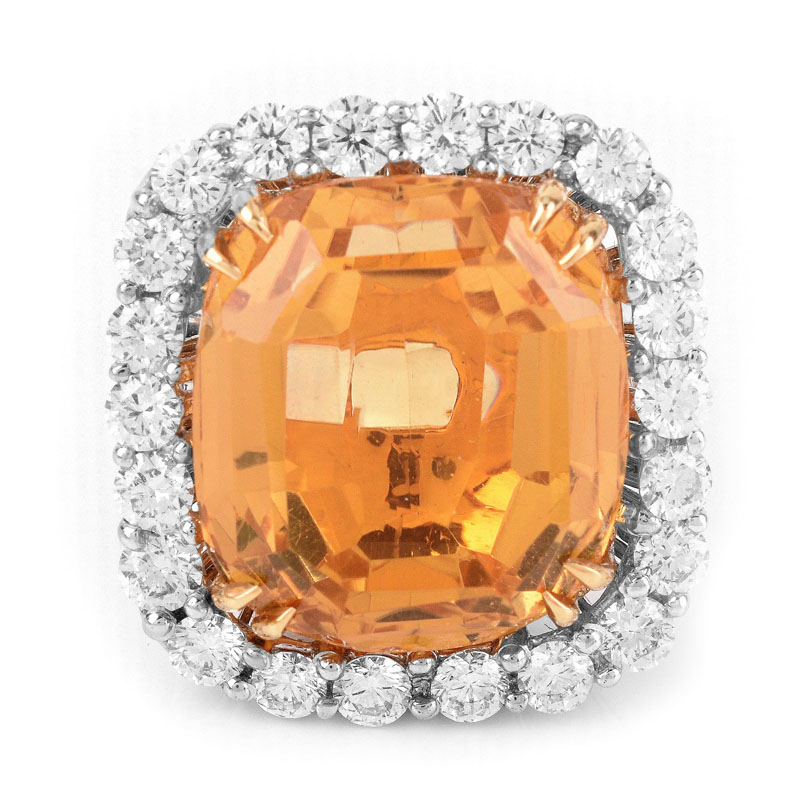 Approx. 23.0 Carat Cushion Cut Citrine, 2.20 Carat Round Brilliant Cut Diamond and 18 Karat White Gold Ring. Citrine with vivid color. Stamped 750. Very good condition. Ring size 6-3/4. Approx. weight: 20.7 grams. Shipping $28.00 (estimate $3000-$5000)