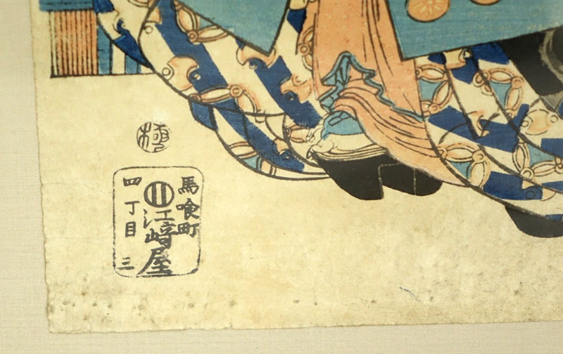 19th Century Japanese Wood Block Print By Yeisen (1809-1849). Signed. Label en verso "Guaranteed by SM Shiba, Miyanoshita". Toning from age, possibly laid down. Nicely framed. Measures 14" x 10-1/4", frame measures 20" x 15". Shipping $105.00 (estimate $200-$300)