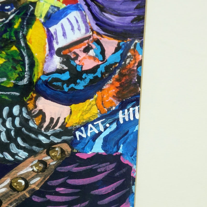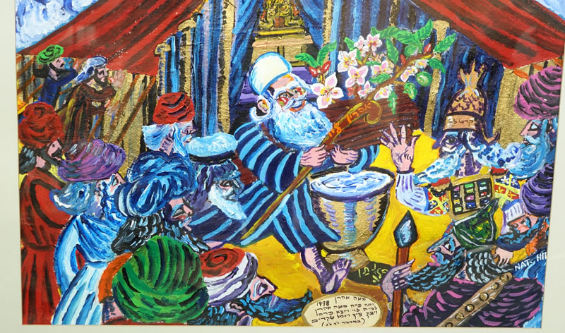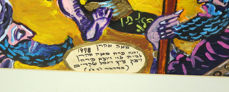 20th Century Israeli Painting on Paper, Inscribed in Hebrew, Signed. Light flaking to paint otherwise good condition. Measures 21-1/2" H x 29-1/2" W, frame measures 29-1/2" H x 37-5/8" W. Shipping $145.00 (estimate $200-$300)