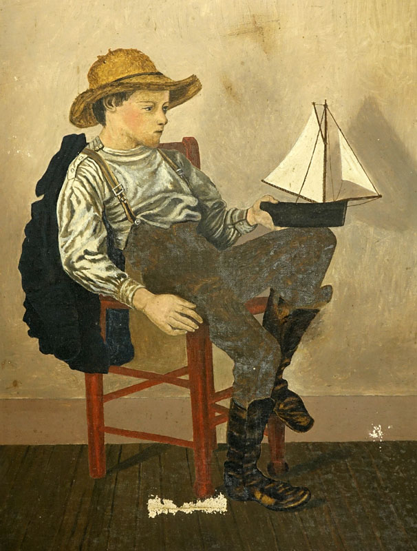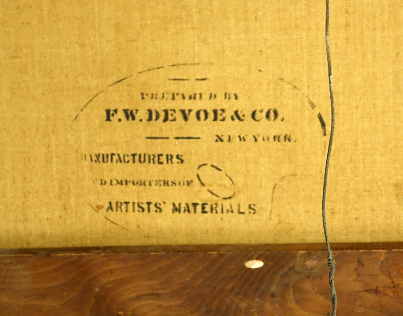 American School, 19/20th Century Oil on Canvas in the Manner of J.G. Brown. Depicts a portrait of a seated male holding a sailboat. F. W. Devoe & Co., New York label stamped on obverse side of the canvas. Wear to canvas, rubbing to paint, and restorations. Measures 20" H x 16" W (canvas), frame measures 23-3/4" H x 19-1/2" W. Shipping $115.00 (estimate $50-$100)