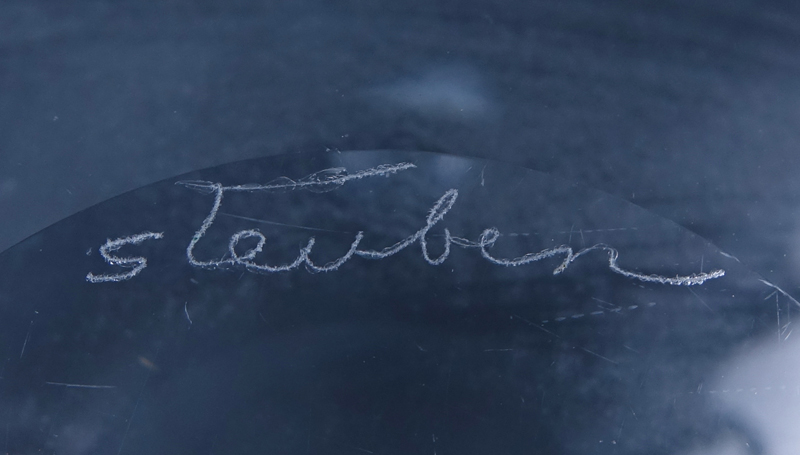 Collection of Lalique, Steuben and Baccarat Crystal Table Top Items. Includes: Lalique Philippines ashtray 8" L, Lalique swirl bowl 4" H, Steuben sauce boat 7" L, Baccarat Twist candlesticks 5-3/4" H. All pieces signed and in god condition. Shipping $75.00 (estimate $200-$250)