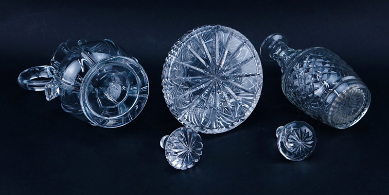 Two (2) Vintage Glass Decanters, One (1) Metropolitan Museum of Art Reproduction Glass Pitcher. Unsigned. One decanter with some interior staining otherwise good condition. Tallest decanter measures 11-1/4" H, 4-1/4" W. Shipping $85.00 (estimate $50-$100)