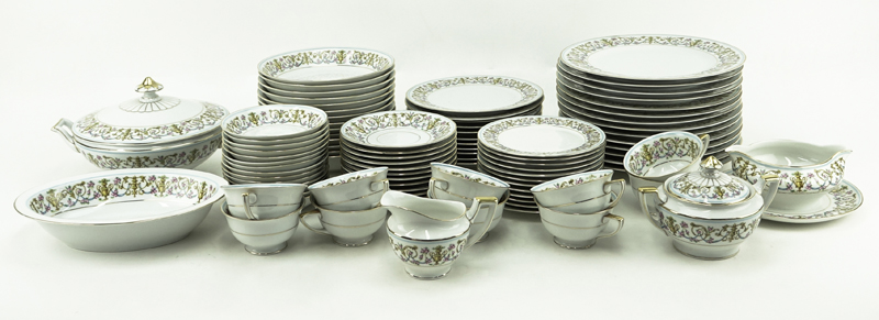 Eighty-Nine (89) Pieces Heinrich H&C Rococo Dinnerware. Set includes: 14 plates 10", 14 soup bowls, 14 fruit bowls, 12 bread & butter plates (1 w/hairline), 10 cups (2 w/chips), 12 saucers (2 w/chips), covered tureen, open oval vegetable bowl, sauce boat, creamer, pitcher. All pieces marked appropriately. Condition good or as described. Shipping: Third party. (estimate $200-$300)
