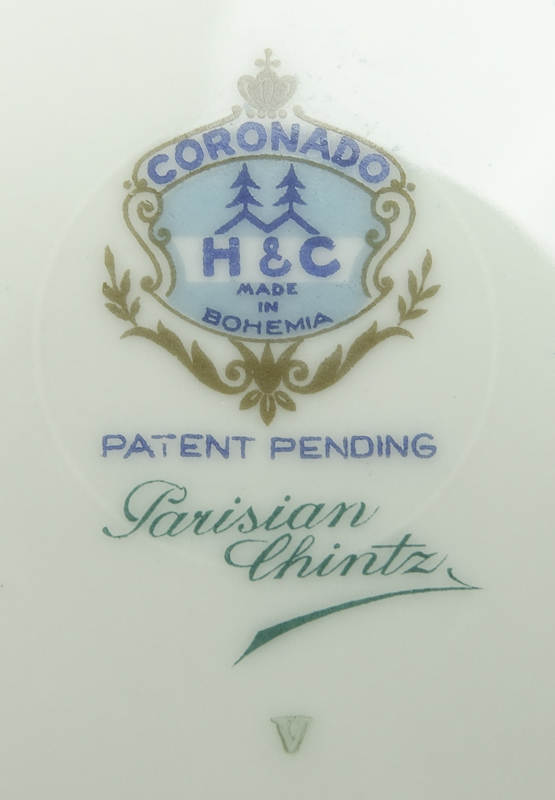 Eighty Two (82) Piece Haas-Czjzek Coronado "Parisian Chintz" Porcelain Dinner Service. Includes: 11 dinner plates 10" Dia., 12 salad plates, 11 bread/butter plates, 12 rim soup bowls, 12 fruit/desert bowls, 6 cups (hairline to one cup), 12 saucers, covered vegetable, gravy boat, creamer, sugar, and 2 oval serving platter (largest measures 15" W). Signed and titled to base. Shipping: Third party. (estimate $100-$200)