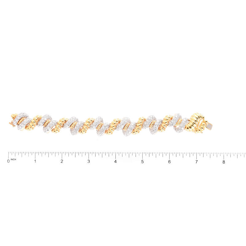 Vintage Approx. 7.50 Carat Pave Set Round Brilliant Cut Diamond and 18 Karat Yellow Gold Bracelet. Diamonds G color, VS1 clarity. Stamped 18K. Very good condition. Measures 7-1/4" L, 3/4" W. Approx. weight: 91.9 grams. Shipping $32.00 (estimate $8500-$10000)