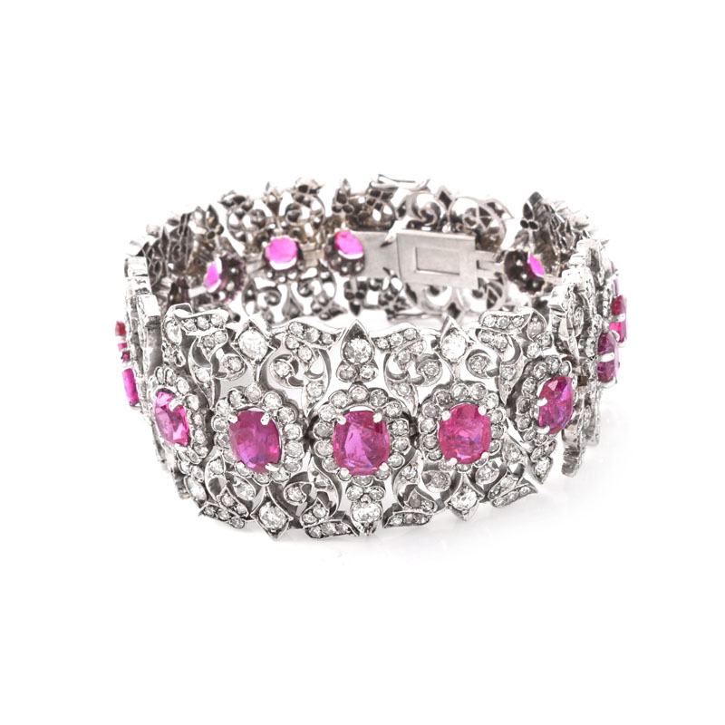 Antique Approx. 20.0 Carat Graduated Oval Cut Burma Ruby, 8.0 Carat Old European Cut Diamond and 18 Karat White Gold Bracelet. Rubies with vivid color. Largest ruby measures 9mm x 7mm; smallest 7mm x 6mm. Unsigned. Very good condition. Measures 7-1/4" L, 1-1/4" W. Approx. weight: 89.9 grams. Shipping $34.00 (estimate $30000-$40000)