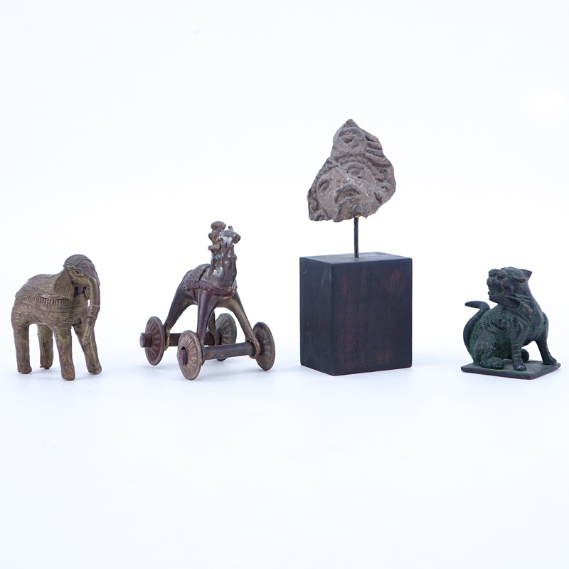 Collection Of Three (3) Asian Bronzes and a Pre-Colombian Pottery Mask, Includes a modern Chinese signed foo dog, Indian elephant, Indian Temple Toy. Unmarked. Wear, rubbing. Pottery mask measures 7-1/2" H including base. Shipping $48.00 (estimate $100-$200)