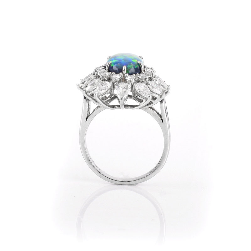 Vintage Tiffany & Co Oval Cabochon Black Opal, Pear Shape and Round Brilliant Cut Diamond and Platinum Ring
