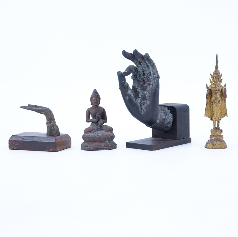 Collection Of Asian Bronzes. Includes a large and small Buddhas Hand and 2 Buddhas. Unsigned. Wear, rubbing. Large hand measures 8" H. Shipping $58.00 (estimate $100-$200)