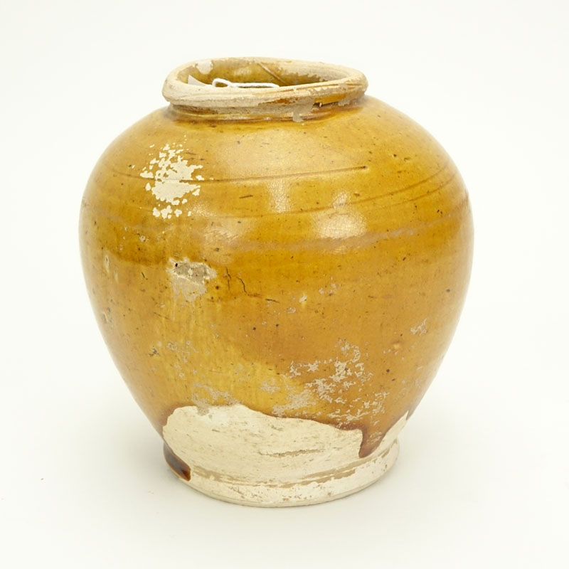Chinese Tang Dynasty Lemon Yellow Glazed Round Vase. Unsigned. Good condition. Measures 5-1/4" H. Shipping $48.00 (estimate $600-$800)