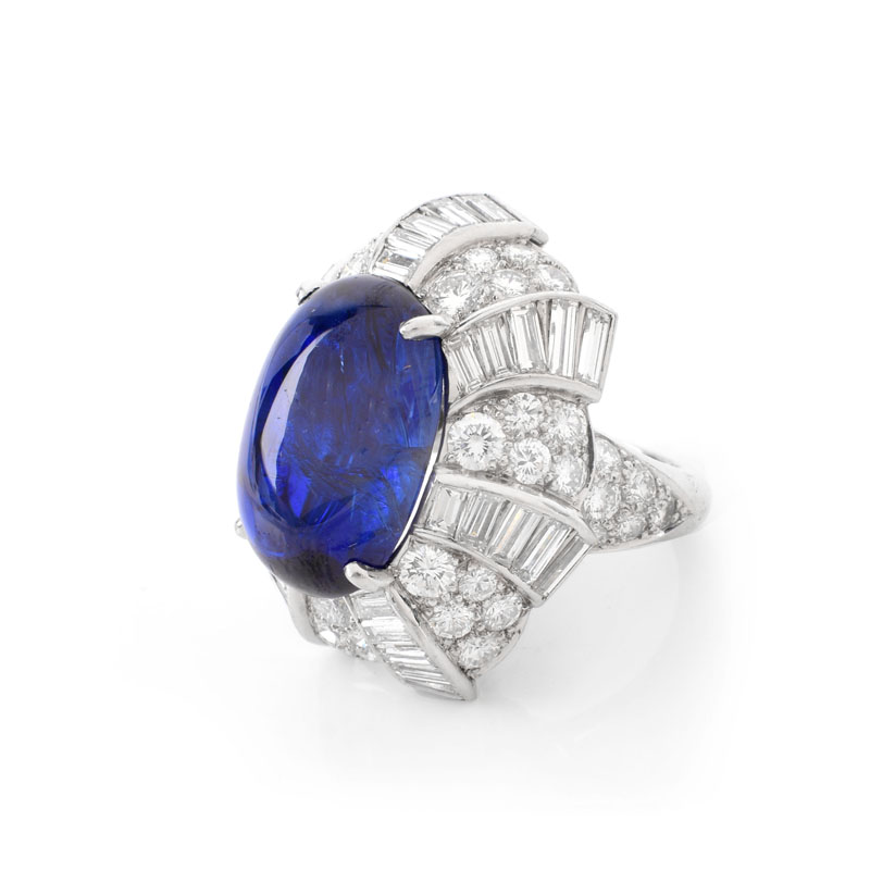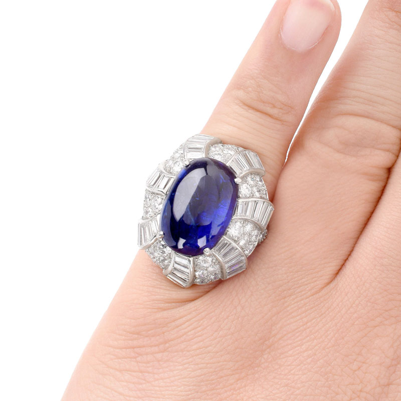 Important Vintage David Webb GIA Certified 17.02 Carat Oval Cabochon Burma No Heat Sapphire, Baguette and Round Brilliant Cut Diamond and Platinum Ring. Sapphire with vivid saturation of color. Signed Webb, Plat. Very good condition. Ring size 5. Approx. weight: 19.8 grams. GIA Report 2145525533 dated 3/29/2012 to accompany this lot. Shipping $30.00 (estimate $45000-$65000)