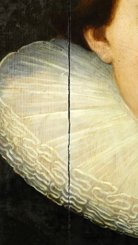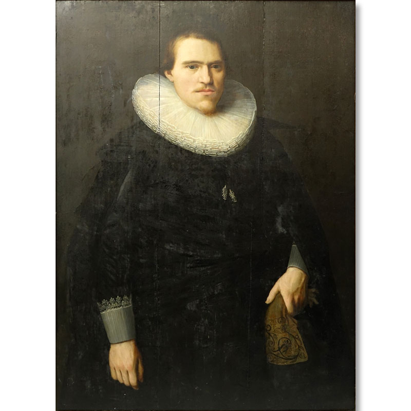 Circle of: Cornelis van der Voort, Flemish (1576-1624) Oil on board "Portrait of a Gentleman In A Black Suit With Ruff". Unsigned. The panel split in 2 places with modern cradle back. Measures 45-1/4" x 33-1/2" x 53-3/4" x 41-1/4". Shipping: Third party. (estimate $15000-$20000)