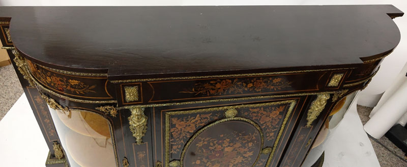Early 20th Century French Napoleon III style Gilt Bronze Mounted Marquetry Inlaid Demi Lune Credenza. Two fitted glass doors with central door, figural mounts with floral marquetry. Wear to veneer, scuffs and scratches, a portion of the fittings one fitted door is missing. Measures 45" H x 73" W x 18" Depth. Shipping: Third party. (estimate $1500-$2500)