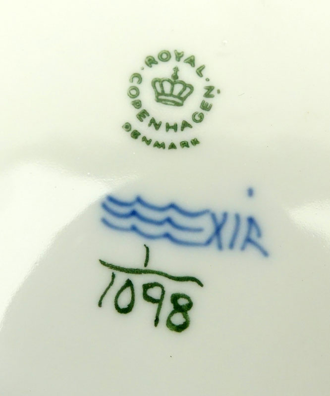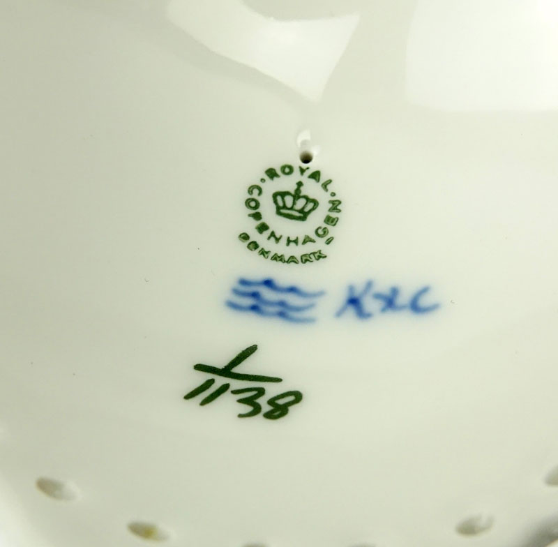 Three Piece Royal Copenhagen Table Top Items. Includes pair of candlesticks #1138 4” H, serving dish #1098 10” dia. All pieces marked appropriately with no cancellation marks. Good condition with no chips or cracks. Shipping $85.00 (estimate $200-$300)
