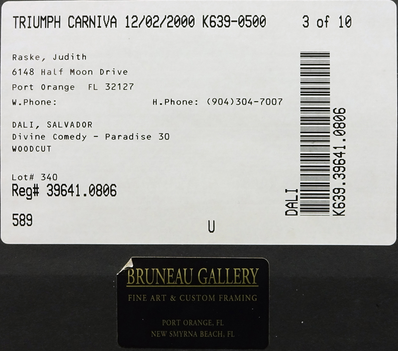 After: Salvador Dali, Spanish (1904 - 1989) Color wood engraving on Rives paper after a watercolor "Divine Comedy - Paradise 30". Signed in the block, blindstamp of the editor J. Estrade. COA and appraisal from Park West Gallery accompanies this lot. Good condition. Measures 9-1/2" x 7-1/8", frame measures 21-1/2" x 19". Shipping: 145.00 (estimate $200-$300)